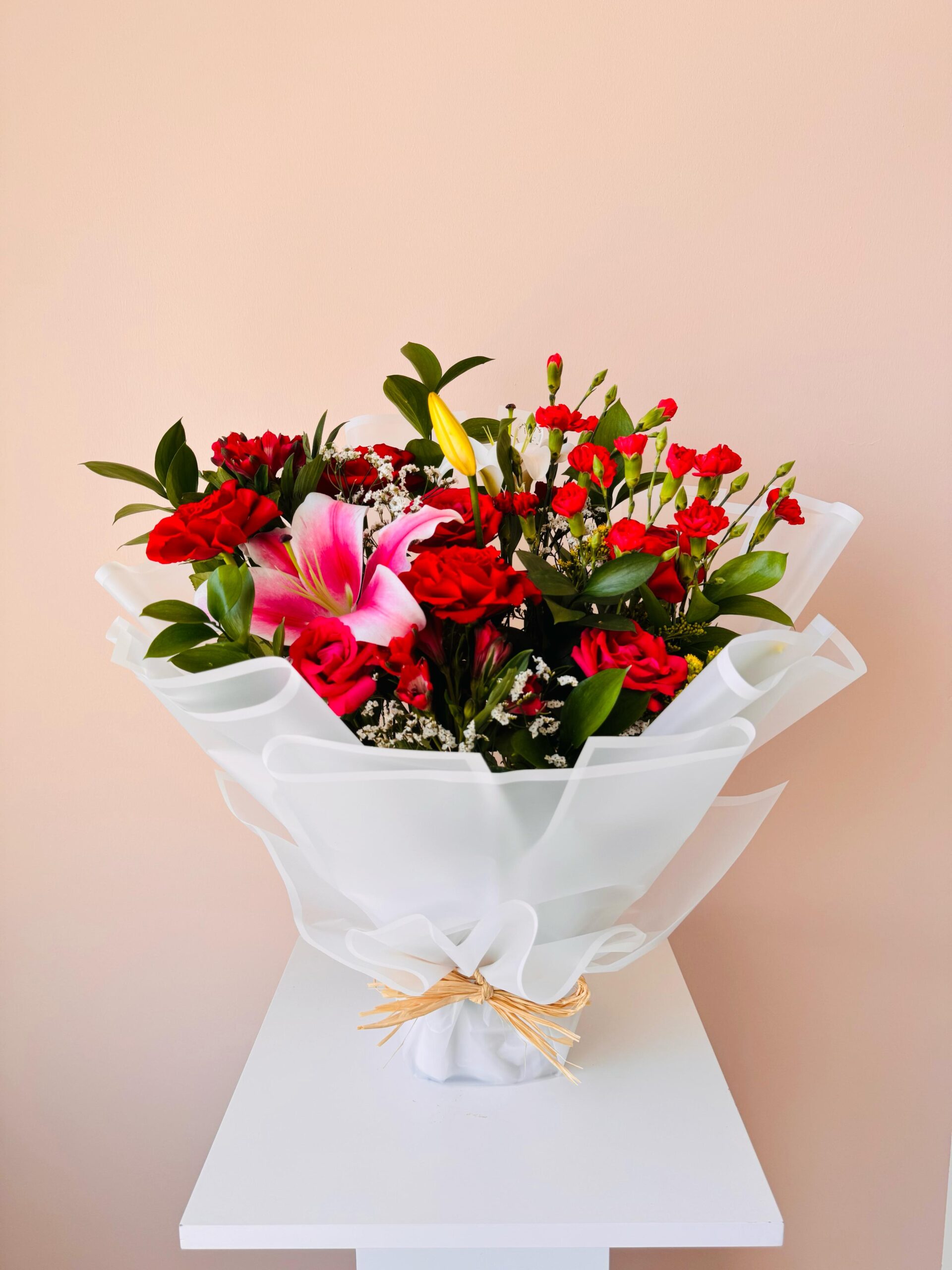 Radiant Romance is a bold and enchanting bouquet that speaks the language of love with every bloom. This vibrant arrangement features a stunning medley of deep red roses, mini carnations, soft white fillers, and a striking pink lily at its heart, complemented by lush greenery and a bright yellow anthurium for an unexpected twist of color. Elegantly wrapped in sheer white organza-style paper and tied with a rustic raffia ribbon, this bouquet beautifully balances passion, grace, and warmth.