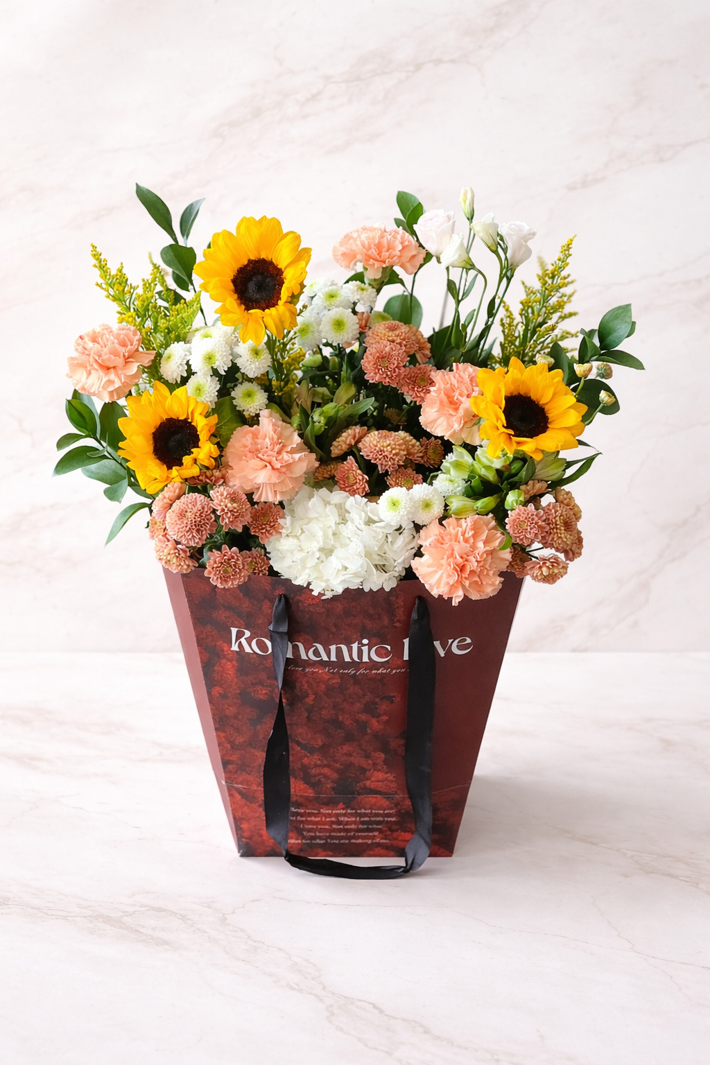 A radiant blend of warmth and elegance, the Sunlit Romance Floral Box features vibrant yellow sunflowers paired with soft peach carnations, delicate white blooms, and fresh greenery. Arranged in a stylish keepsake box with satin handles, this bouquet captures the perfect balance of cheerful brightness and romantic charm. Ideal for birthdays, anniversaries, or simply to brighten someone’s day, it delivers a heartfelt message of joy, admiration, and love.